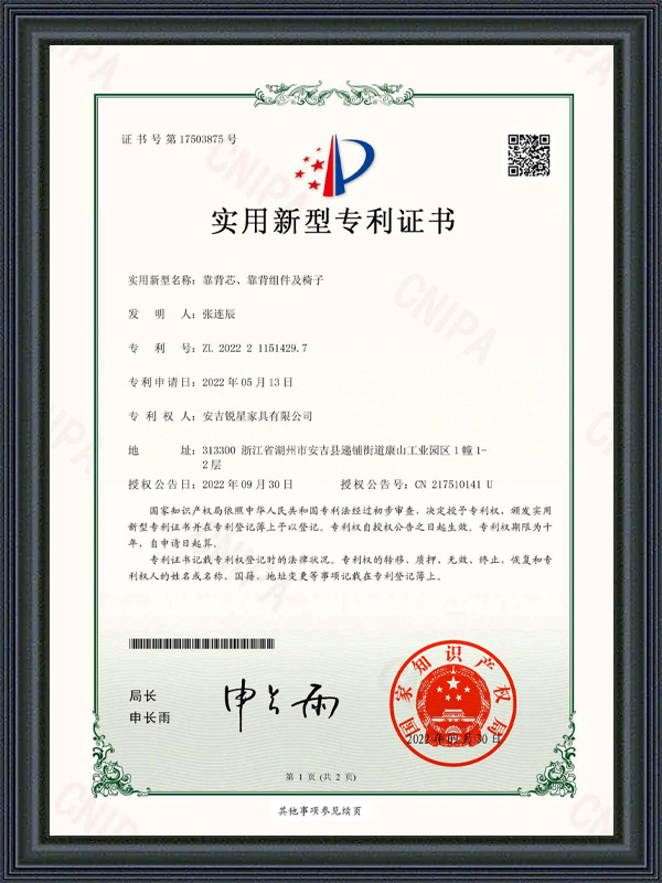 สิทธิบัตรสำหรับแกนพนักพิง ชุดพนักพิง และเก้าอี้